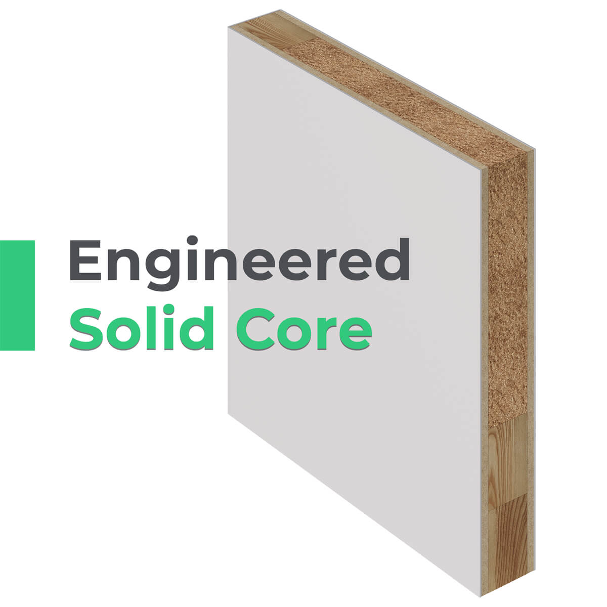 Door filling: engineered solid core is an innovative eco-friendly wood fiber material with 12.5 lb/ft³ density. It is responsible for soundproofing and keeping heat inside the room.