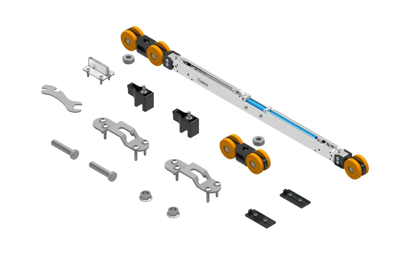SF-P140 hardware set for sliding wooden doors (max. 308lbs). Double soft-close mechanism and ball bearings. Mounting with surface-mounted plate.