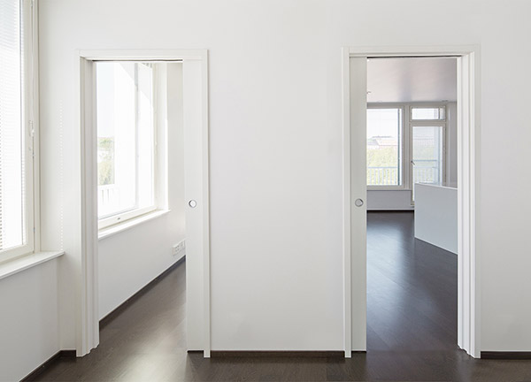 ECLISSE Unilateral is the solution that allows two opposite doors to slide into the same pocket. Thus, you have the chance to use even the tightest spaces to close two separate, distinct rooms: in the opening phase the two door panels take the space of a single wall section.