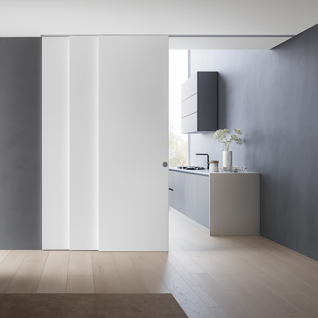 The multi-slide hardware set allows the installation of door panels up to the ceiling height. Made of anodized aluminum, it is fixed to the ceiling with brackets and allows to give a flush finish to the ceiling. It has a decentralized door guide and door dragging system.